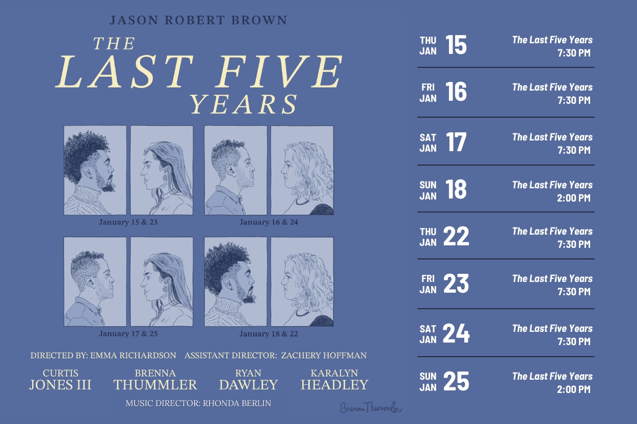 The Last Five Years is an intimate musical that explores the rise and unraveling of a relationship between Jamie, a charismatic young writer, and Cathy, an actor fighting for her big break. Through raw honesty and unforgettable songs by Jason Robert Brown, the show traces how love can ignite with possibility and still crack under the weight of ambition, timing, and the things left unsaid. It's a bittersweet look at two people who care deeply for each other but can't seem to grow in the same direction.