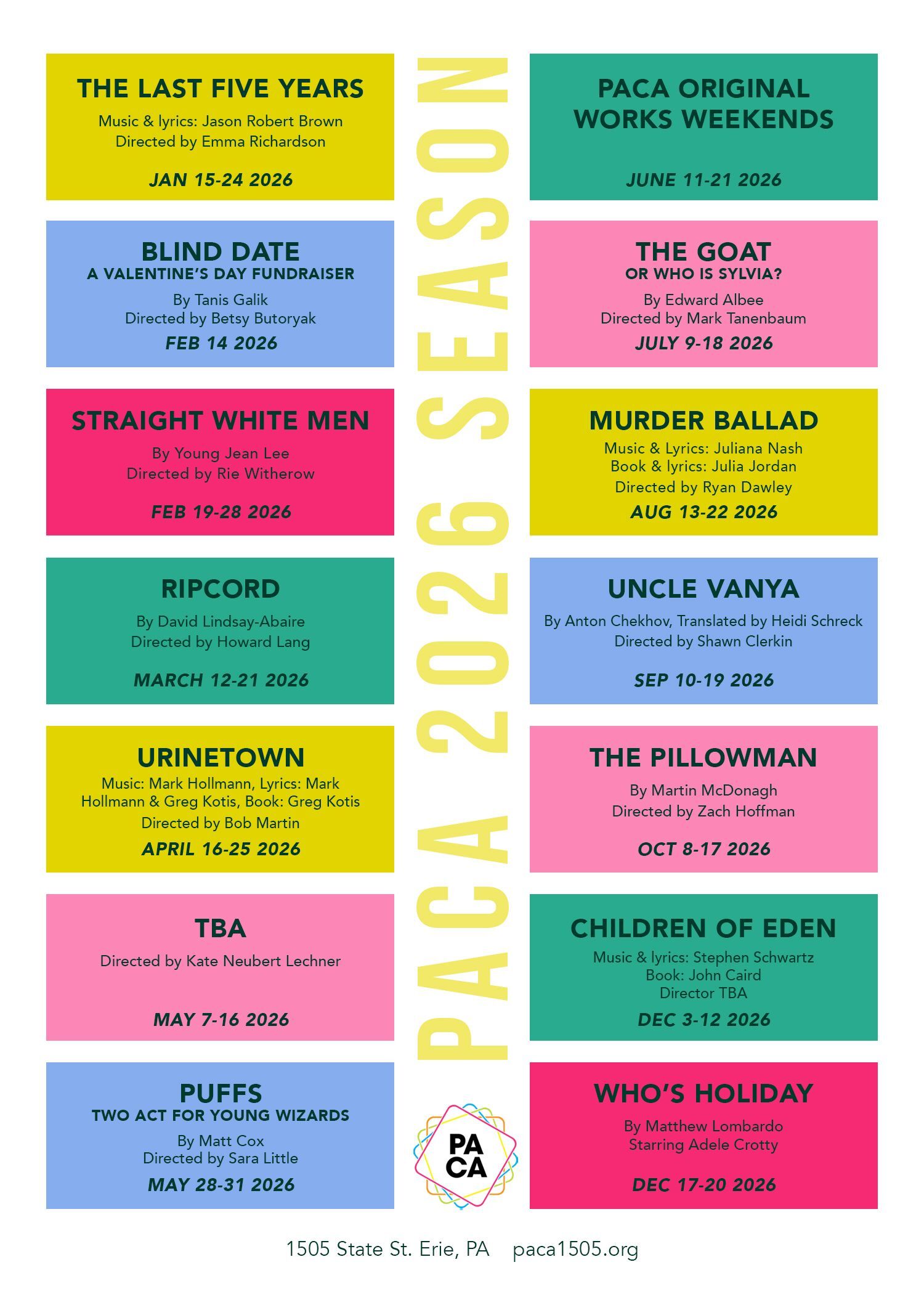 The stage is set for another unforgettable year of bold, imaginative, and inspiring live theater at PACA! Our 2026 Theatrical Season brings together a vibrant mix of classics, contemporary works, and original productions all designed to challenge, delight, and celebrate the power of performance in Erie’s most creative space.